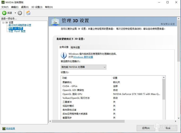 选择管理3D设置,首选图形处理器调到高性能显卡处理器,GPU也调到显卡,垂直同步关闭,下拉,电源管理模式选择高性能,质量选择高性能,其他的看情况调节,最好不动