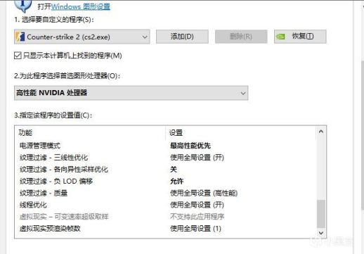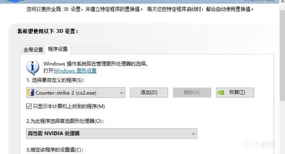 因为CS2是新的游戏了,之前有添加的还要重新添加设置一下,这边记得选择CS2程序添加,首选图形处理器也是高性能显卡处理器