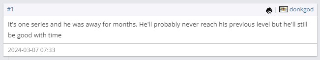 -拜托哥们,这是他离开赛场几个月之后的第一场比赛。他可能永远无法回到自己的巅峰状态了,但是给他一点时间,他还是会变得很好的。