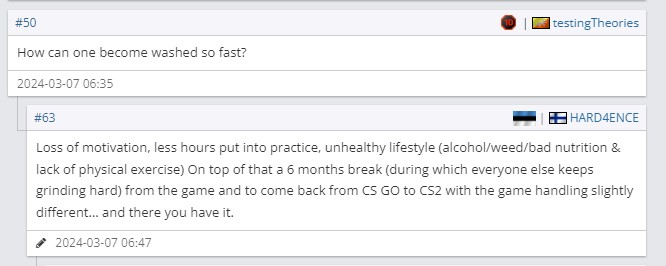 -没动力、不练习、生活习惯也乱七八糟的(喝酒、抽烟,吃的东西没营养还不体育锻炼),最重要的是他还休息了六个月(在此期间其他人都在努力训练),从CSGO的比赛当中转到CS2来,其中很多游戏细节和比赛中的处理方式很不一样……这就是为啥s1mple现在打成这样。