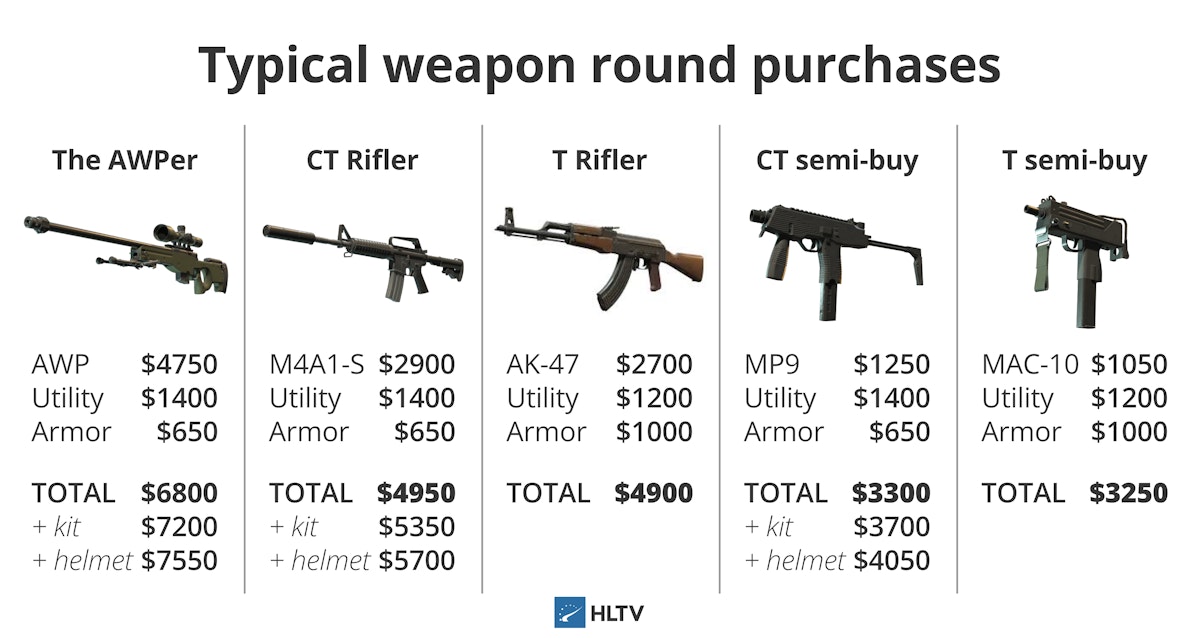 这些游戏内货币用于购买武器、手雷、护甲,以及CT的拆弹套装。它还引入了一个战略元素:决定是购买装备还是节省金钱——被称为经济局(ECO局)——以确保在未来的回合中能进行全起。因此,拥有良好的游戏内经济变得至关重要,因为购买最好的装备将在很大程度上影响回合的进行。在手枪回合后输掉或在焦灼的比赛中,做出这些战略选择尤其关键。