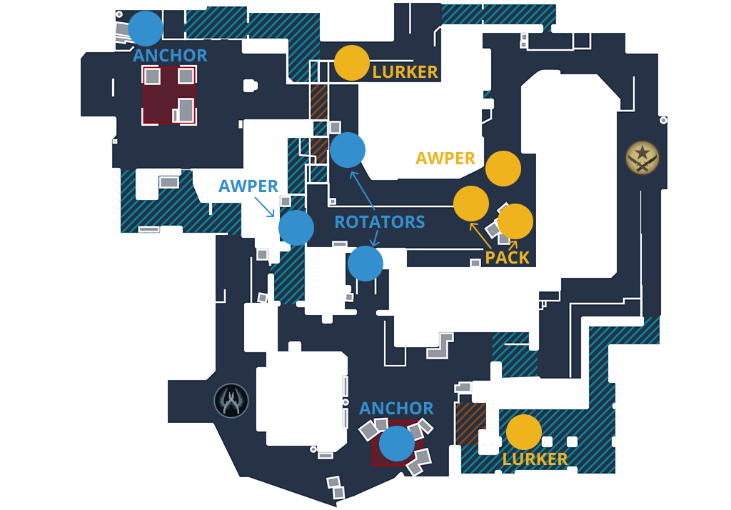 随后是两个自由人(Lurker)。这些玩家像小区防守者一样行动,保持地图控制,以便队伍可以安全地转移到另一个包点。在这个一般角色中,有些是更激进的潜行者;孤狼,他们喜欢找到开局首杀和扰乱CT的回防。然而,传统的自由人会打的更加被动;在现代,最能体现这一点的选手便是ropz或KSCERATO。