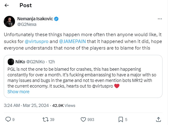 -对于这些事情发生在VP和Jame身上真的感到由衷不幸,这些东西发生在他们战队身上的频率真的有点太多了。但是还是希望大家理解,没有任何一个选手应该为此负责,请不要指责选手们。
