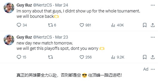 有趣的是,在Nertz的社交动态下,刚好有一句游戏广告这么写着——真正的英雄要全力以赴,否则都是空。希望X队能够在接下来继续磨合,为下一场战斗做好准备。