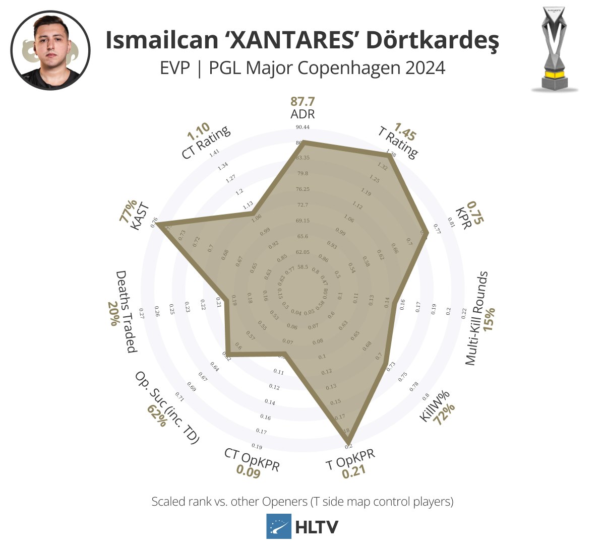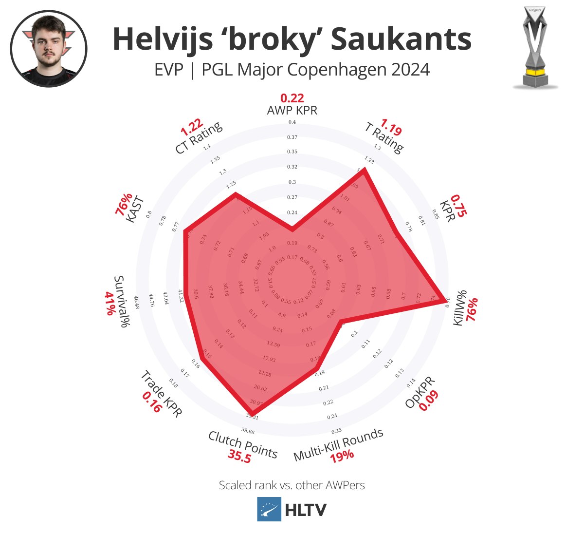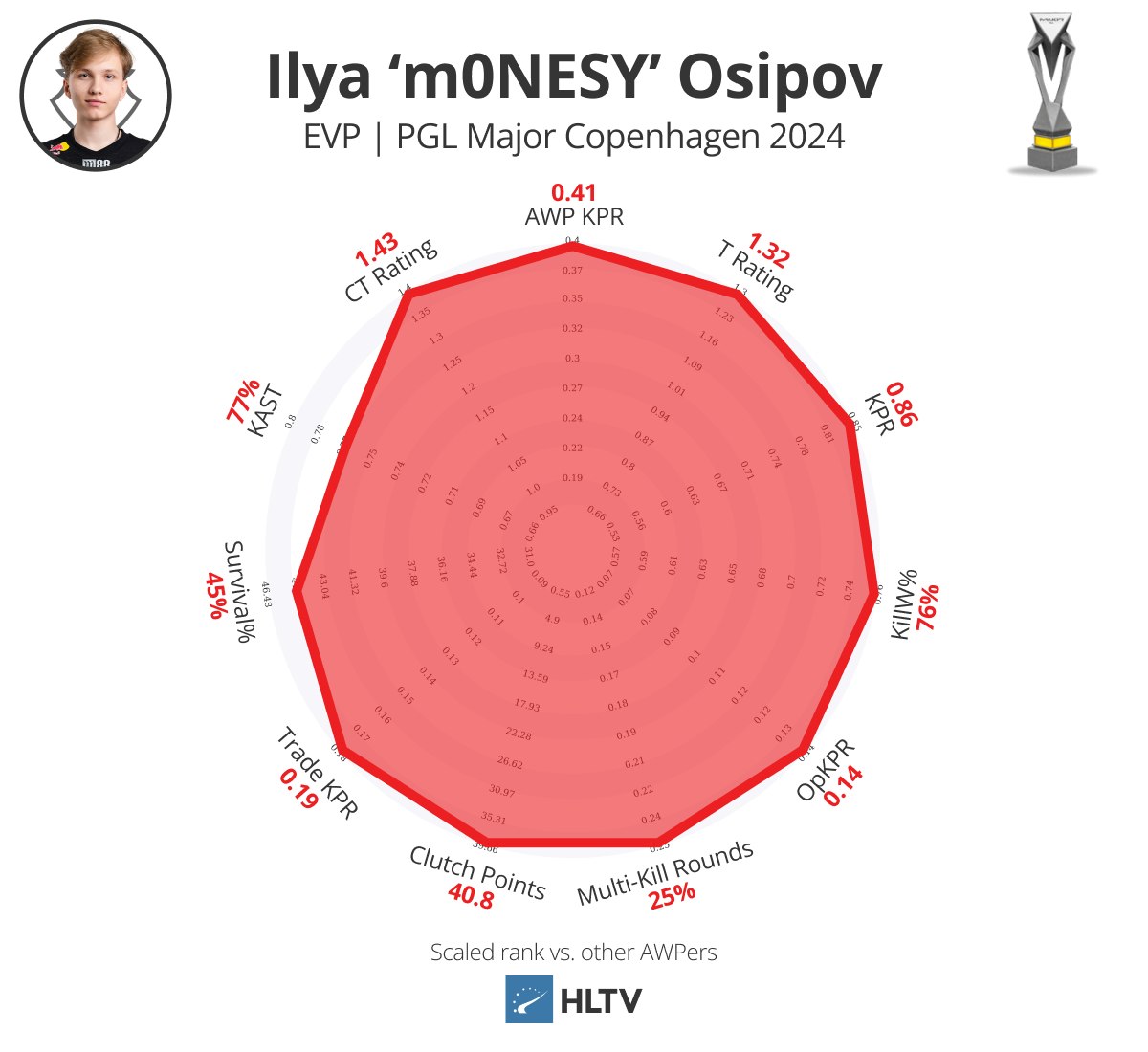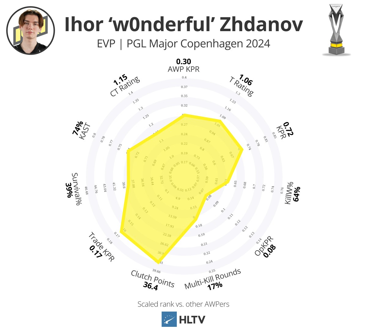 个人而言,从卡托维兹中的惊人表现下降是预料之中的,确实如此,但他依旧保持了爆炸性的击杀能力(0.90 KPR,27%多杀回合)和影响力,强行跻身EVP名单。