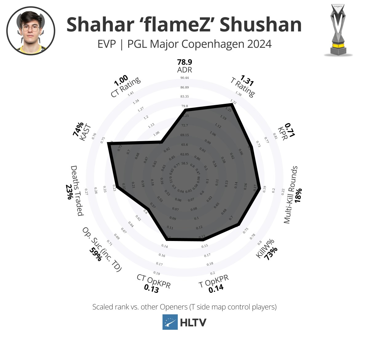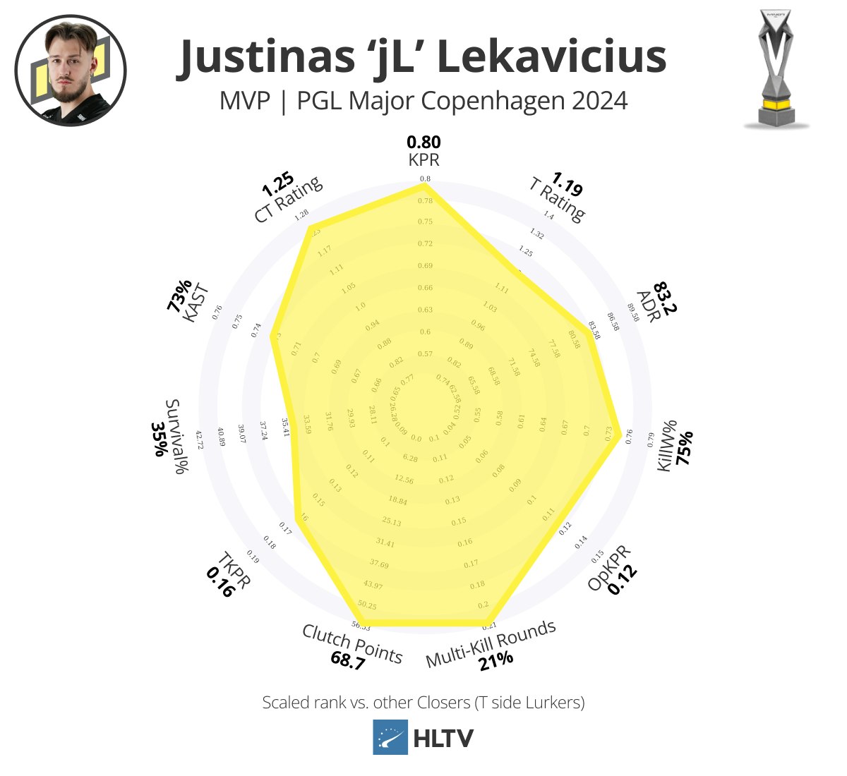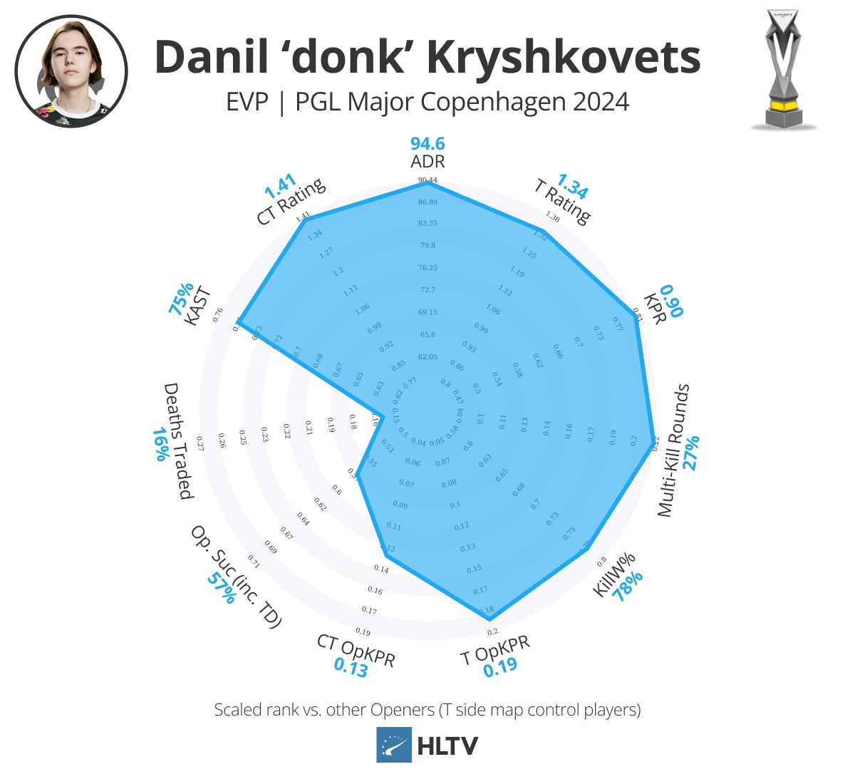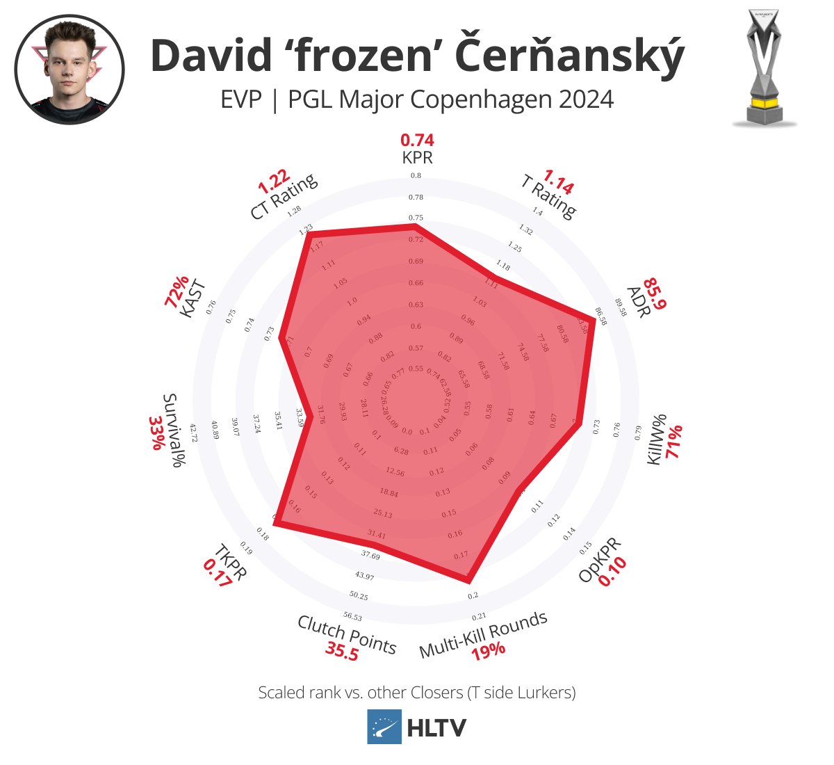 个人而言,从卡托维兹中的惊人表现下降是预料之中的,确实如此,但他依旧保持了爆炸性的击杀能力(0.90 KPR,27%多杀回合)和影响力,强行跻身EVP名单。