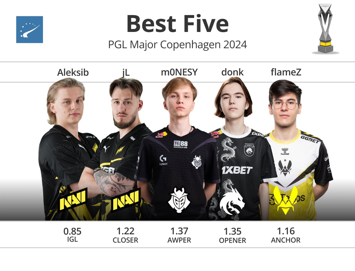 随着EVP的决定和排序,我们现在可以组建我们的Major梦之队了。m0NESY和donk很可能整年都是我们的狙击手和进攻性步枪手的不二人选。flameZ在小区防守者位置上超过了b1t,而MVP jL则担任主要的自由人角色。 最后,Aleksib在带领NAVI赢得大满贯荣耀后,填充了该阵容指挥位的位置。确实有个别选手在一些关键时刻挺身而出,但总的来说,这仍然是一次团队的胜利。
