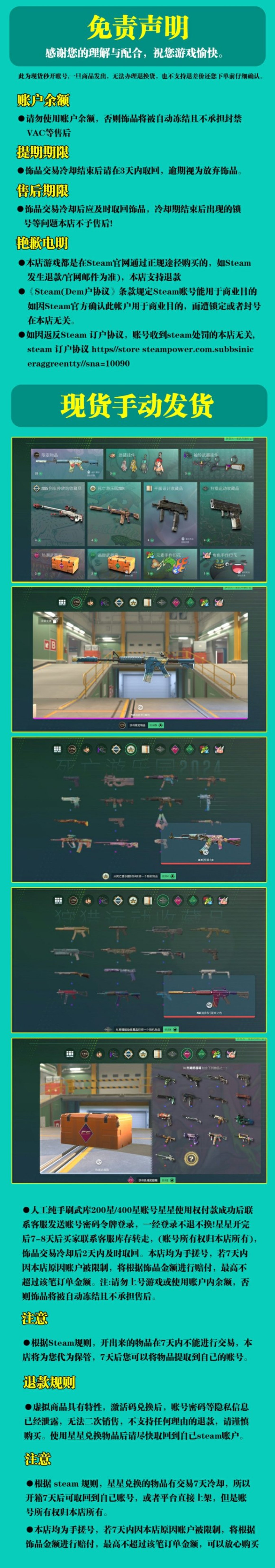 人工纯手刷武库200星/400星账号星星使用权付款成功后联系客服发送账号密码令牌登录,一经登录不退不换!星星开完后7-8天后买家联系客服库存转走,(账号所有权归本店所有),饰品交易冷却后2天内及时取回。本店均为手搓号,若7天内因本店原因账户被限制,将根据饰品金额进行赔付,最高不超过该笔订单金额。注:请勿上号游戏或使用账户内余额,否则饰品将被自动冻结且不承担售后。
